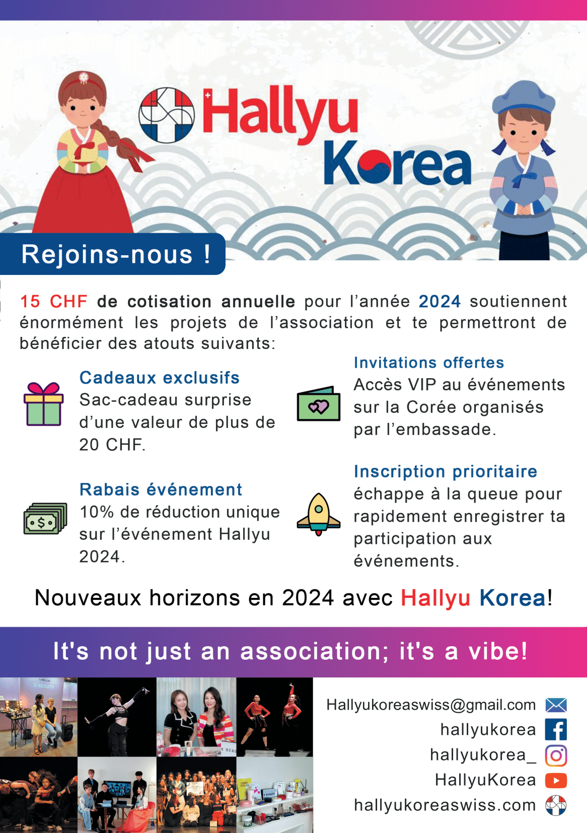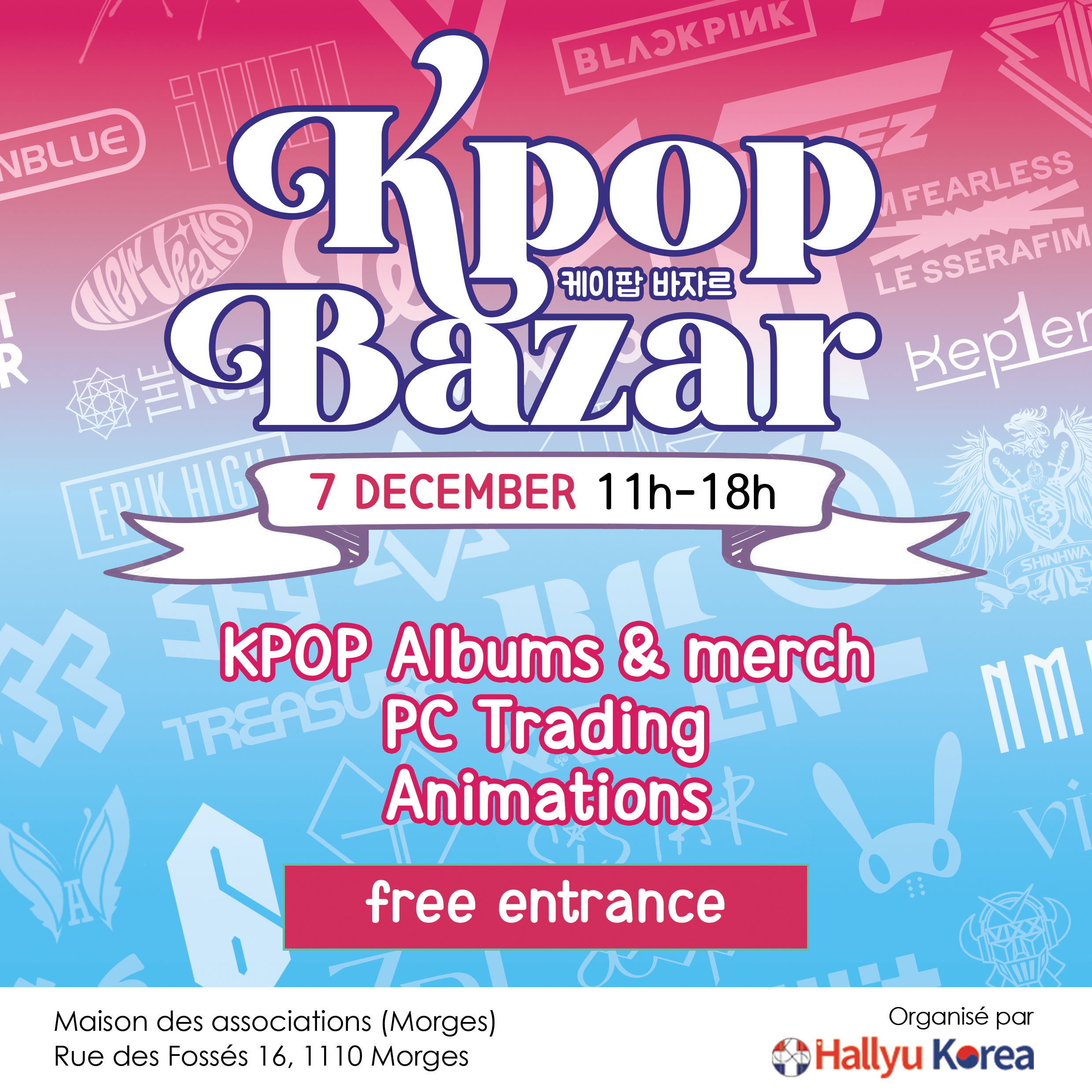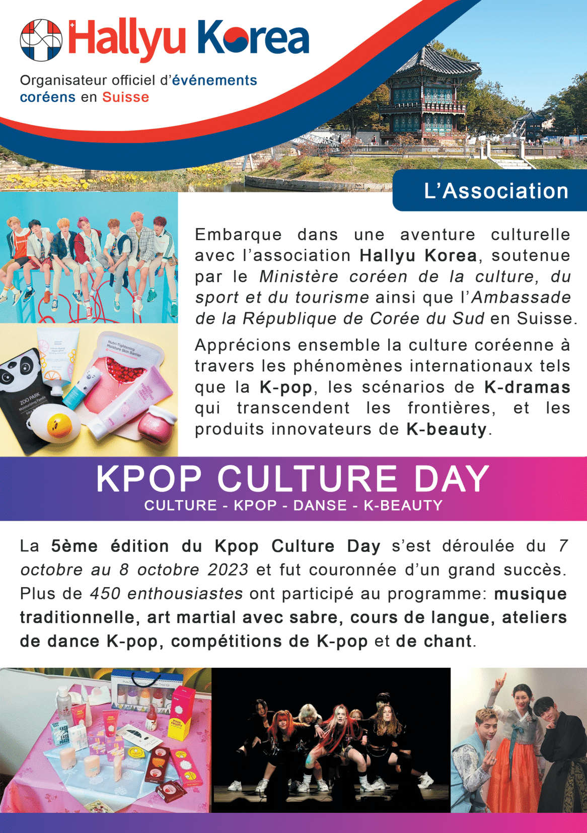 Hallyu Korea is a Swiss-based association dedicated to promoting Korean culture. Supported by the Korean Ministry of Culture and the Korean Embassy, it organizes activities such as K-pop competitions, food tastings, film screenings, and traditional arts programs across Switzerland.