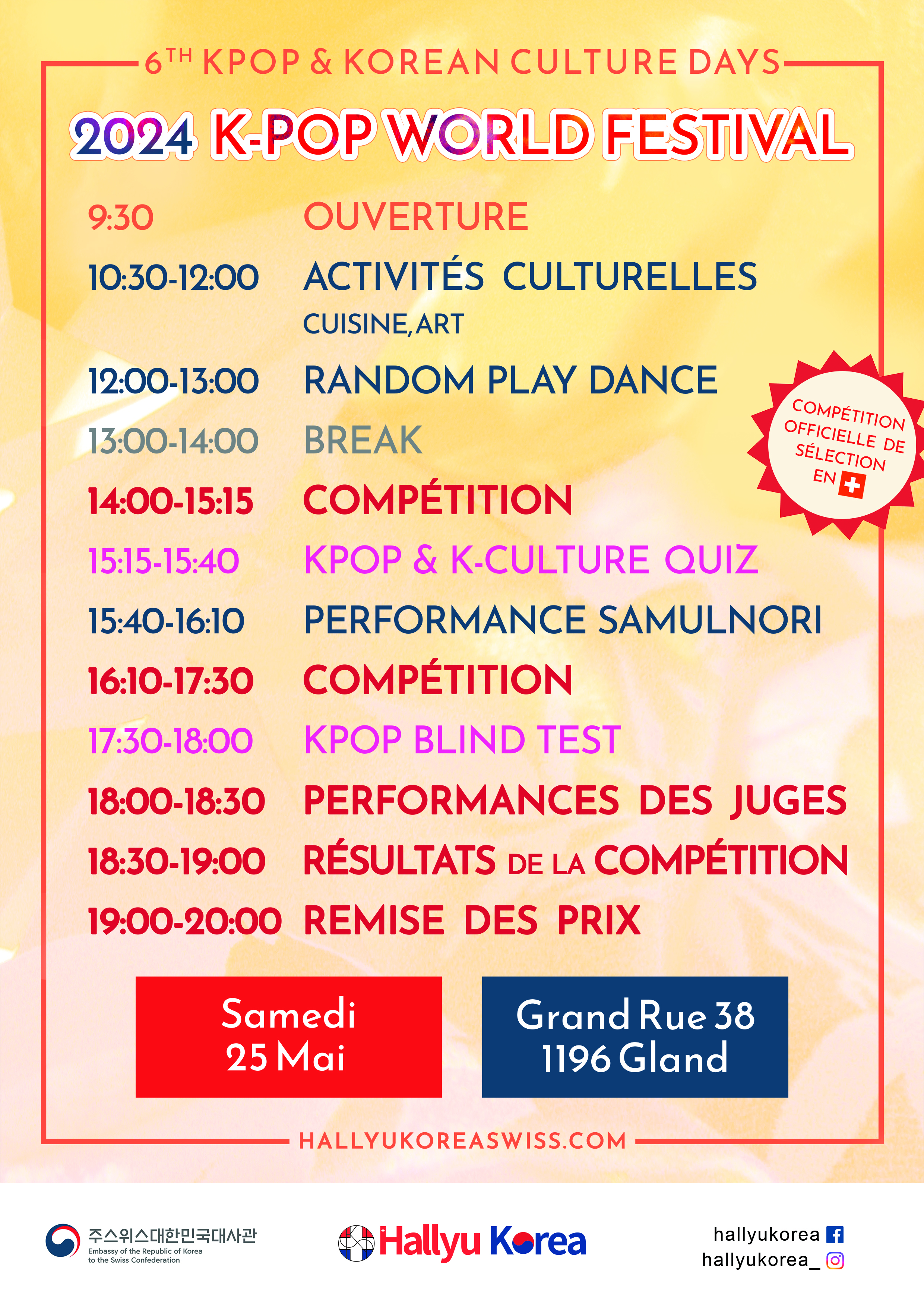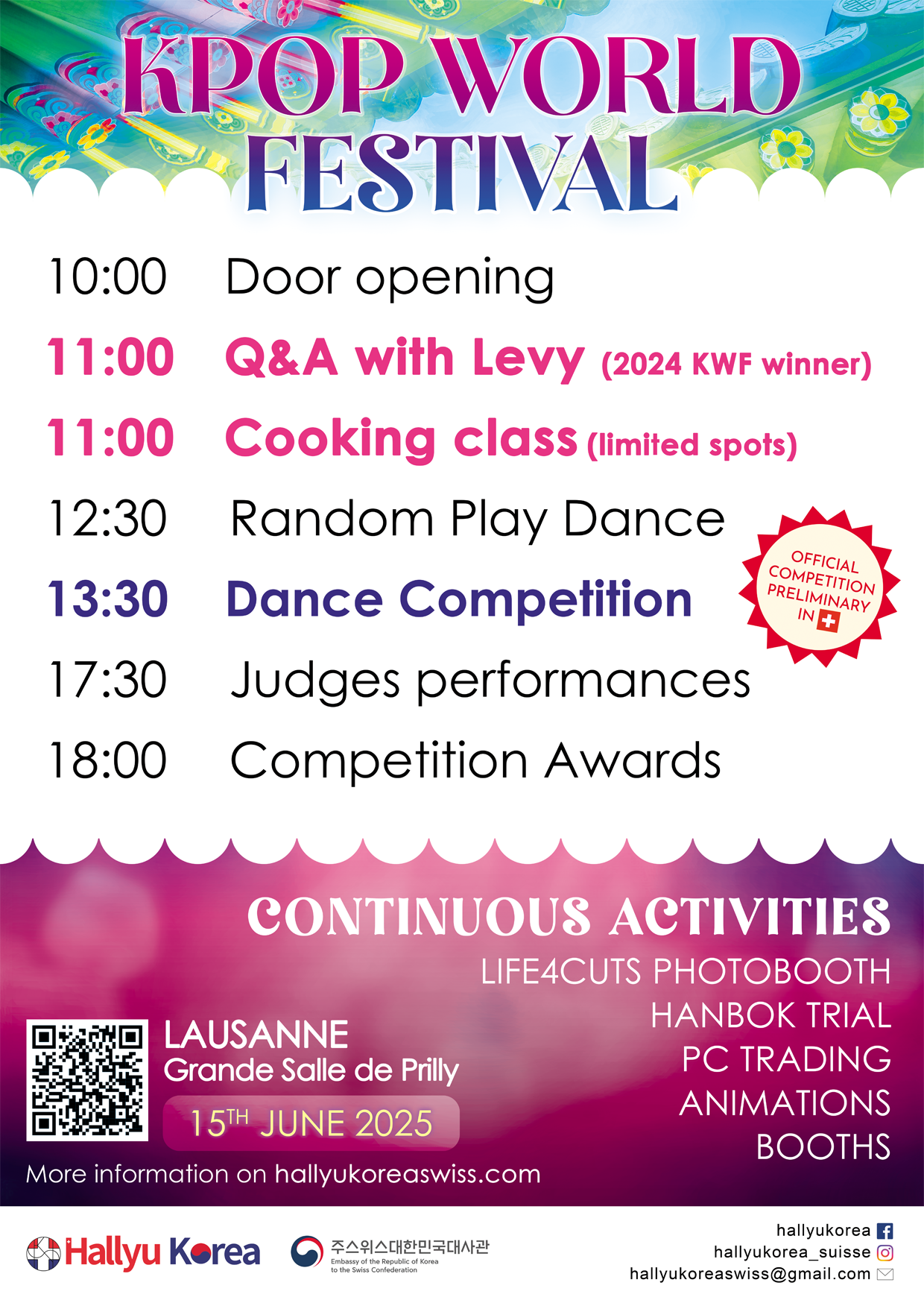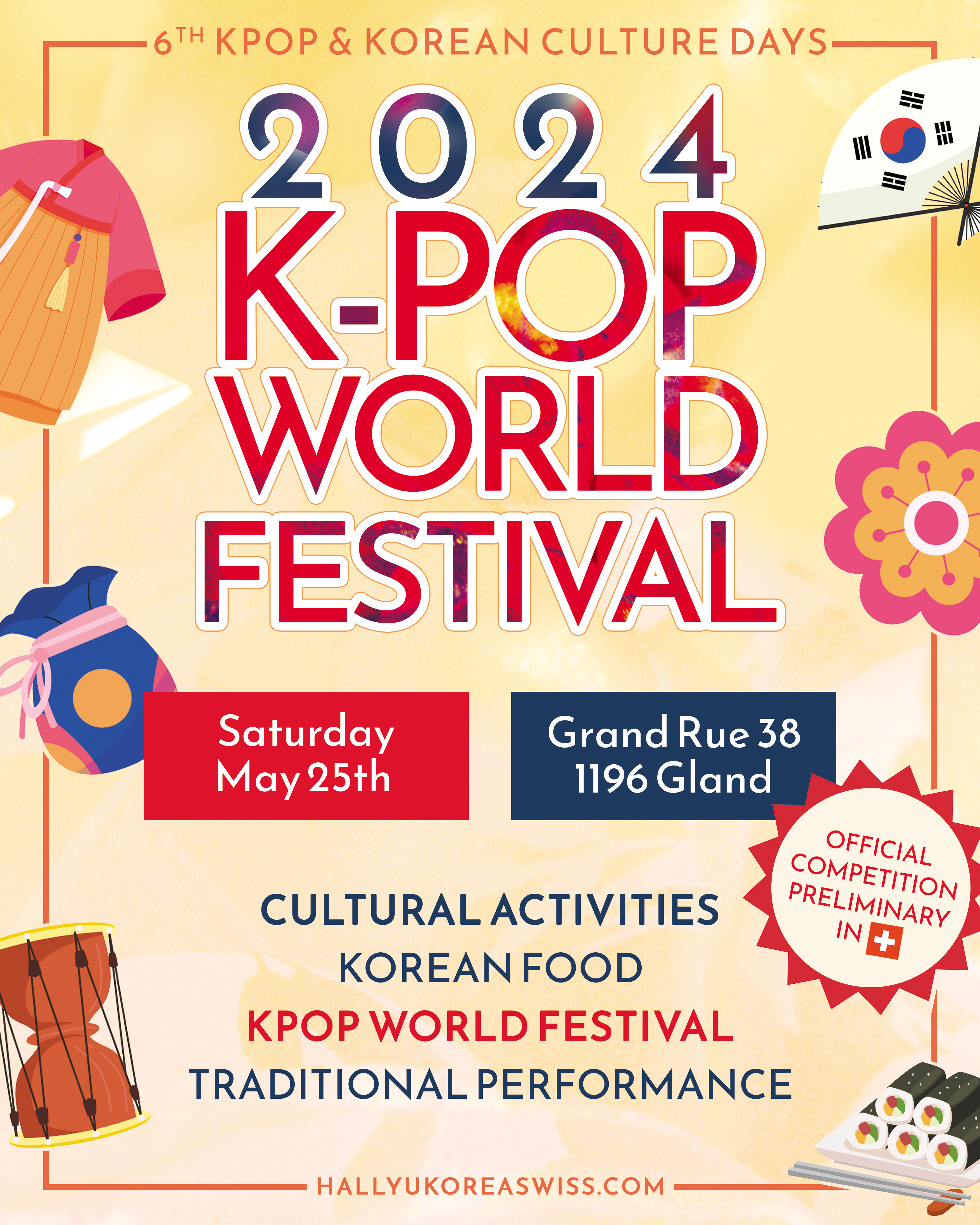 Once a year, Hallyu Korea hosts a major event celebrating the richness of Korean culture, featuring K-pop dance contests, language classes, cooking workshops, and more. In 2024, the event focused on traditional and cultural aspects of Korea. The event poster showcases a variety of Korean-themed elements, from colorful pouches to traditional hanbok garments, creating a festive and welcoming atmosphere according to the warmth of June. A bold badge proudly highlights a milestone moment: Switzerland's first-ever national selection for the K-pop World Festival in Changwon.